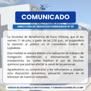 La Sociedad de Beneficencia de Puno comunica que este viernes 11 de julio, a partir de las 2:00 p.m., se suspenderá la atención al público en el Cementerio Central de Laykakota debido a trabajos de fumigación, desinfección y desinsectación.
