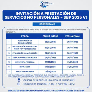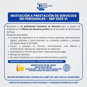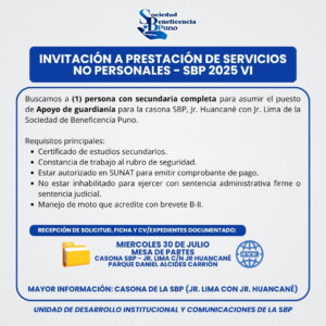 La Sociedad de Beneficencia de Puno invita al proceso de Prestación de Servicios no Personales – SBP 2025 VI, para los siguientes puestos/cargos: