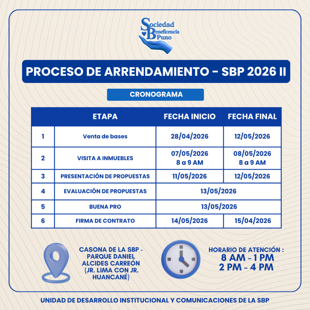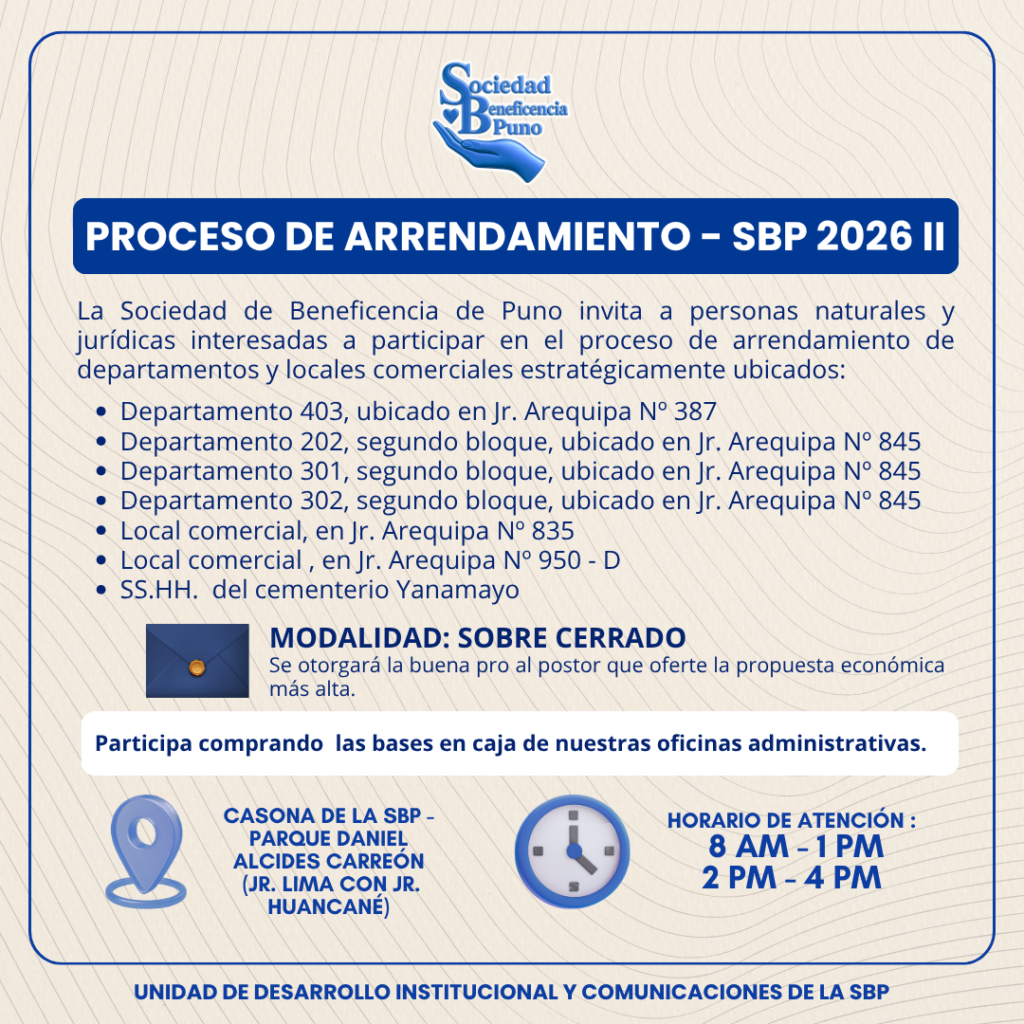 La Sociedad de Beneficencia de Puno anuncia el lanzamiento del Proceso de Arrendamiento – SBP 2026 I.