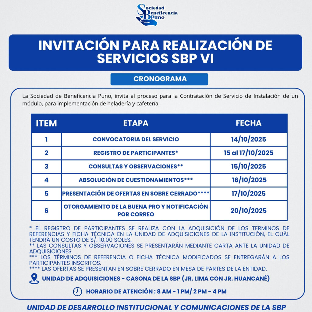 La Sociedad de Beneficencia de Puno invita a las empresas y profesionales proveedores interesados a participar en el proceso de contratación con el objetivo de: Contratar a un proveedor de Servicio de Instalación de un módulo, para implementación de heladería y cafetería.