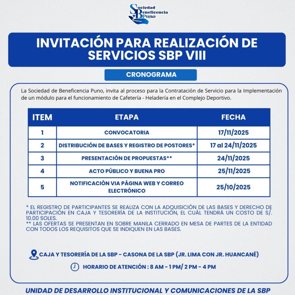 🗓Distribución de Bases y Registro de postores: 17 al 24/11/2025 (*Adquisición de términos de referencia y ficha técnica, costo: S/ 10.00 – Caja y Tesorería de la Institución)