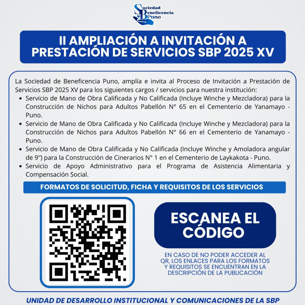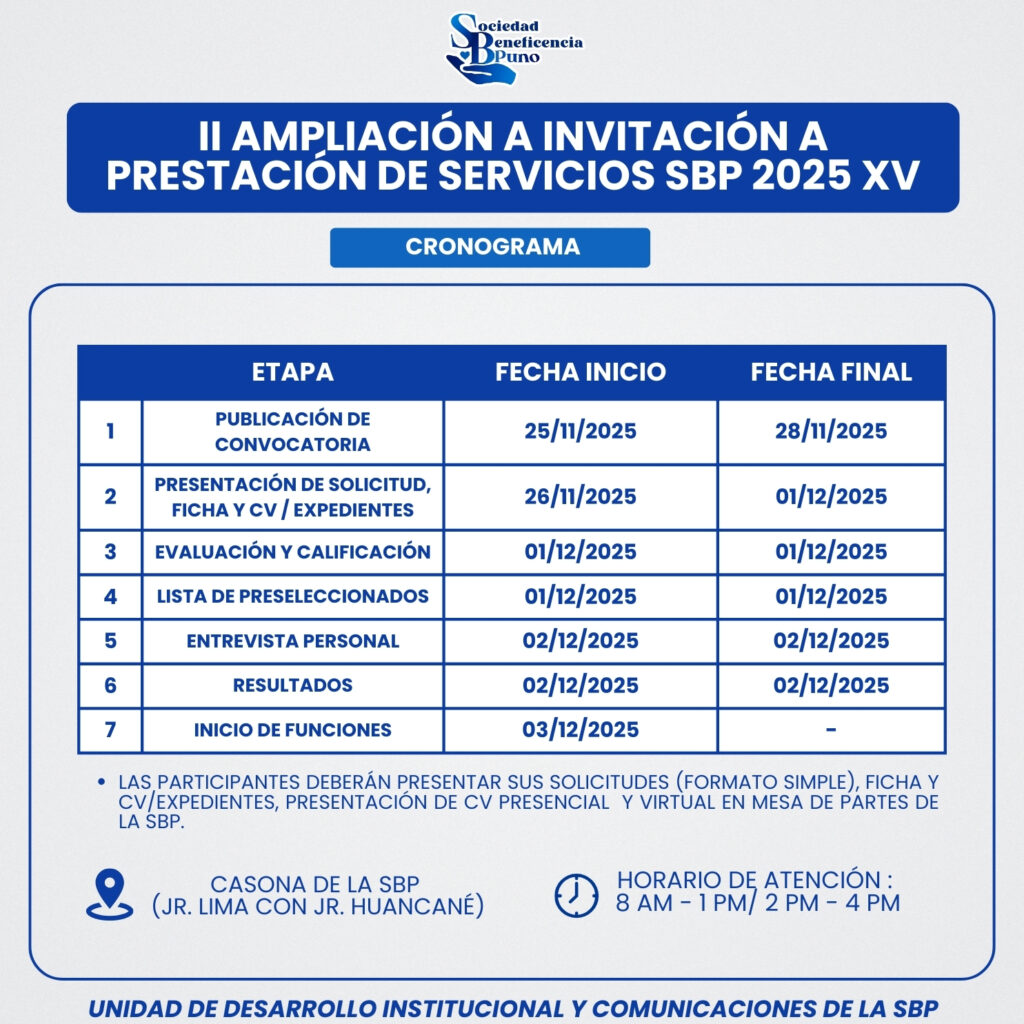 La Sociedad de Beneficencia de Puno, amplia e invita al proceso de Prestación de Servicios no Personales – SBP 2025 XV, para los siguientes cargos / servicios para nuestra institución: