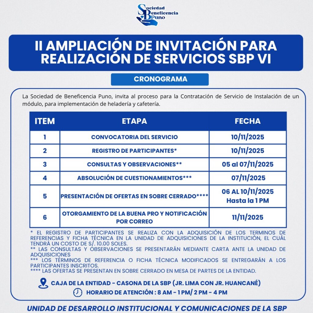 La Sociedad de Beneficencia de Puno invita a las empresas y profesionales proveedores interesados a participar en el proceso de contratación con el objetivo de: Contratar a un proveedor de Servicio de Instalación de un módulo, para implementación de heladería y cafetería.