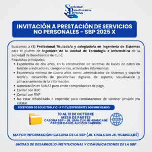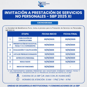 La Sociedad de Beneficencia de Puno invita al proceso de Prestación de Servicios no Personales – SBP 2025 XI, para los siguientes puestos/cargos: