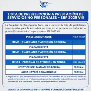 La Sociedad de Beneficencia Puno da a conocer la lista de postulantes preseleccionadas para continuar con la siguiente etapa del proceso: la entrevista personal se realizará el día viernes 29 de agosto según cronograma.