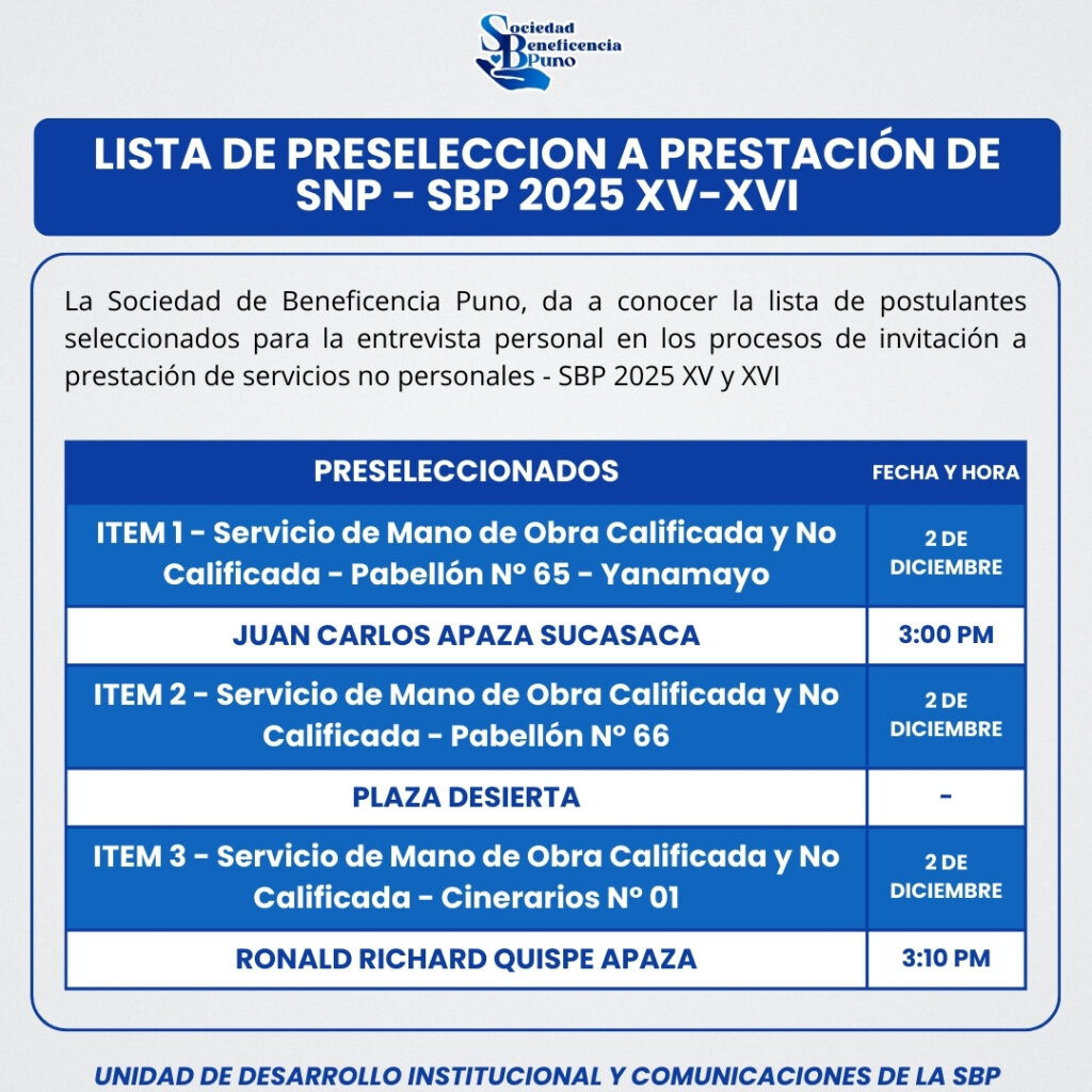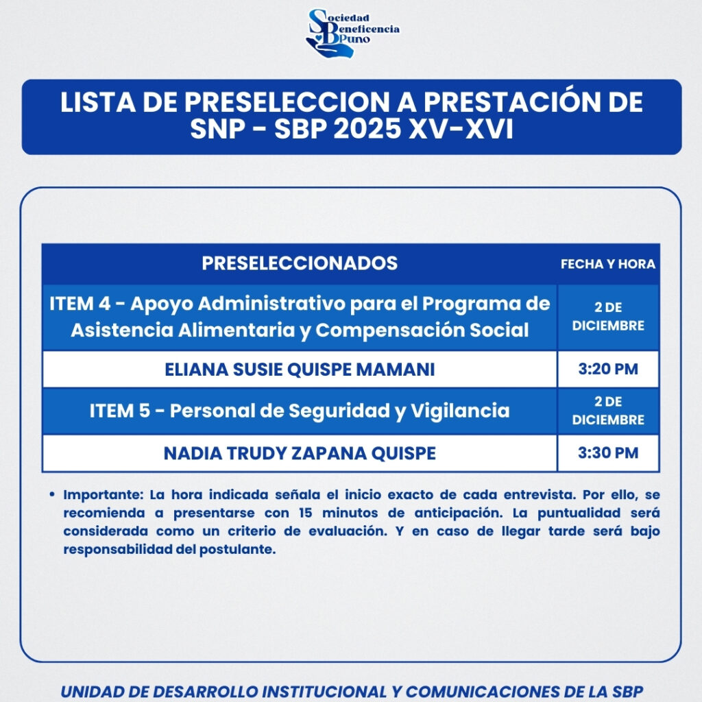 La Sociedad de Beneficencia Puno publica la lista de postulantes preseleccionados para continuar con la siguiente etapa de los procesos Invitación a Prestación de Servicios No Personales SBP XV – XVI: la entrevista personal, la cual se realizará según cronograma el día martes 2 de diciembre, con el siguiente horario: