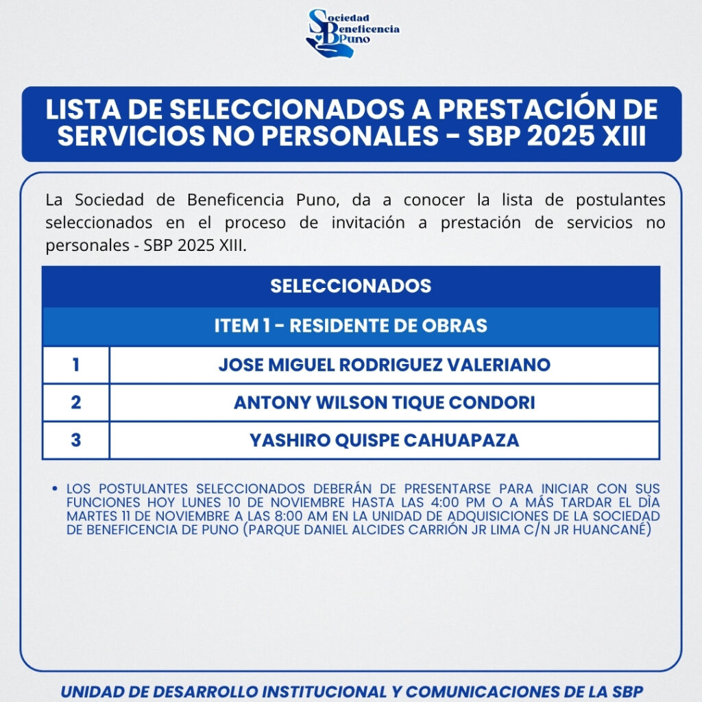 La Sociedad de Beneficencia Puno da a conocer la lista de postulantes seleccionados en el proceso de invitación a prestación de servicios no personales 2025 XIII.